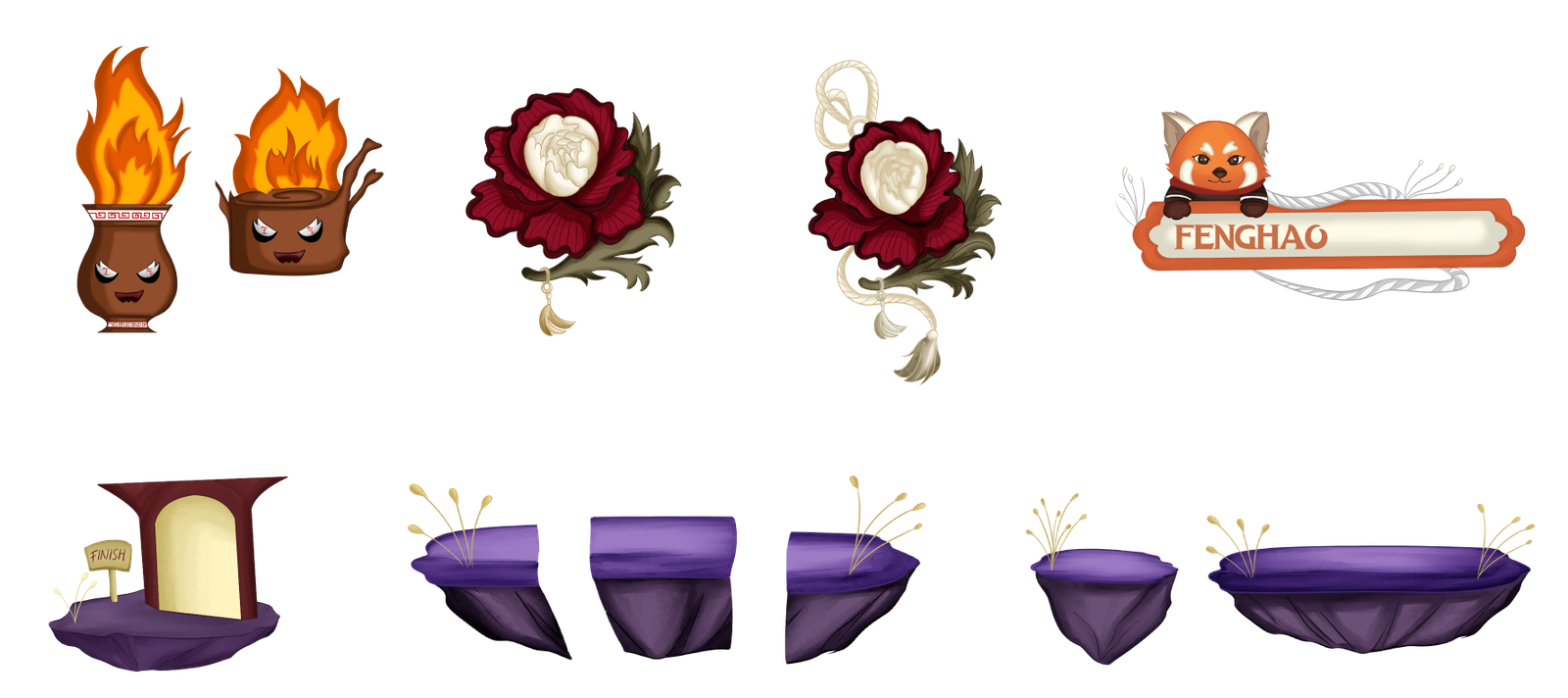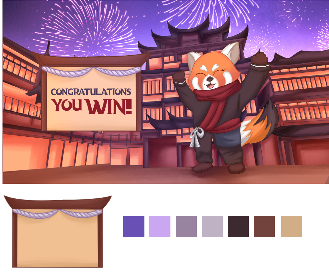 I created the background with a festive atmosphere to show victory with fireworks and happy looking characters. This scene is a formof celebration of the culture that has been acquired after winning the game at each stage by returning items that are the key to chinese culture that has disappeared.