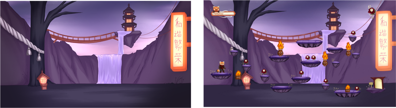Concept: I Made the background in a forest with a waterfall and some chinese cultural ornaments, and because my game concepts is a associated with the incoming of a new culture and the modern life of today that makes chinese culture disappear. I depicted the new culture with the led lights on the right side, and electrical cables as a symbol of today’s life, there is a wooden bridge crossing from the left side to the right as a symbol of time flowing from ancient chinese culture that is increasingly leading towards foreign culture.
