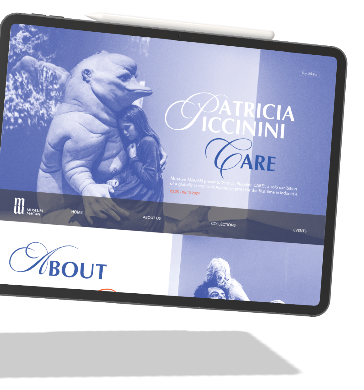 project for the Museum Macan. This design uses typography in subheadings and contrasts with white, navy, and orange.