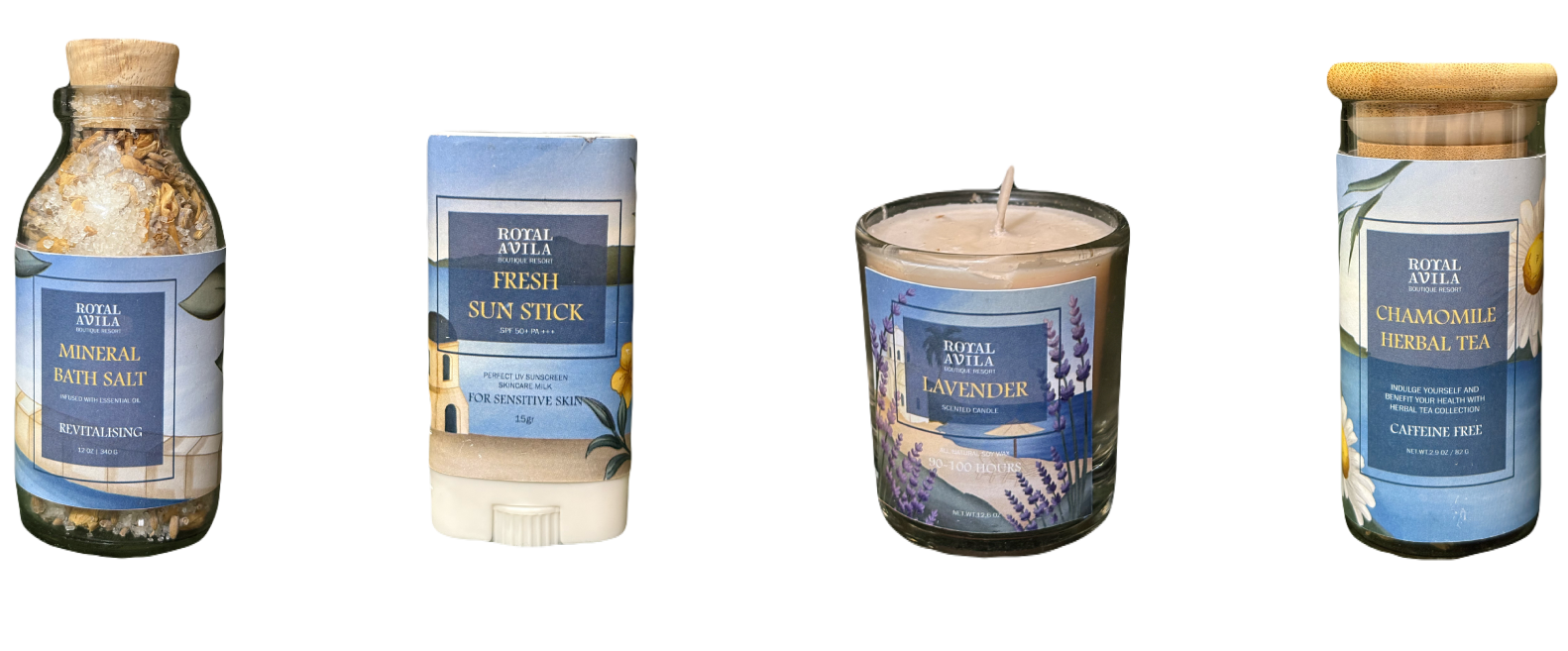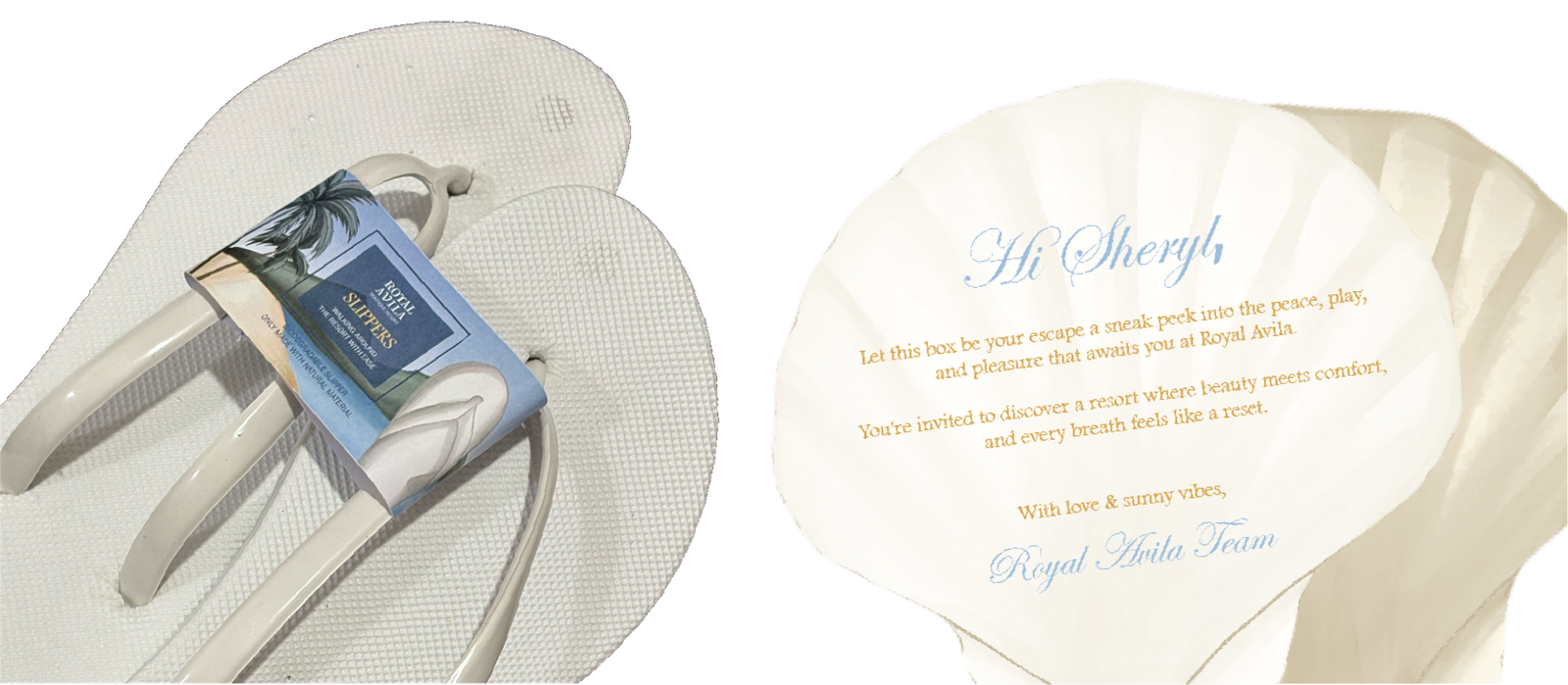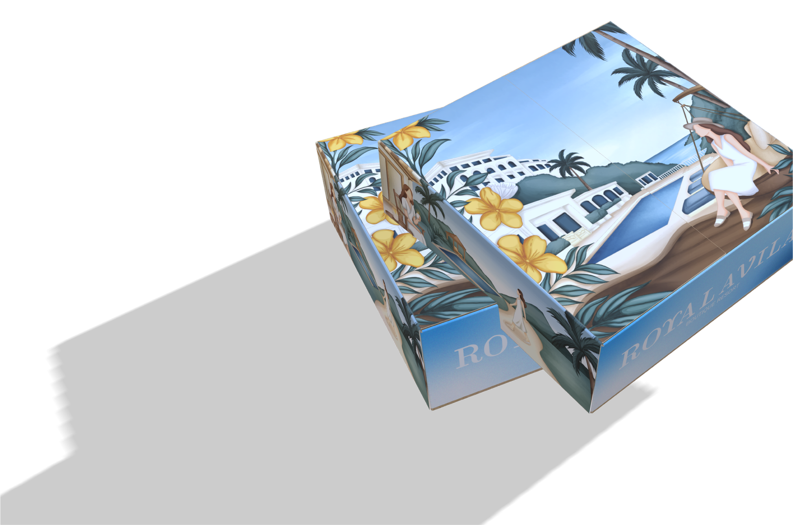 slippers, scented candle, sun sticks, thank you cards, and infused tea. It was created based on the Royal Avila Boutique Resort with a beach resort theme. I used a door box as if when opening the box you enter the resort vibes with various products that will be given to influencers. On each side of the box, I depicted visitors enjoying the hotel