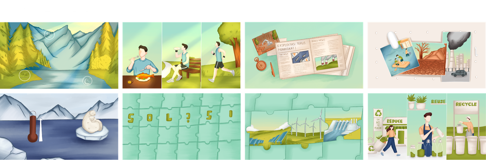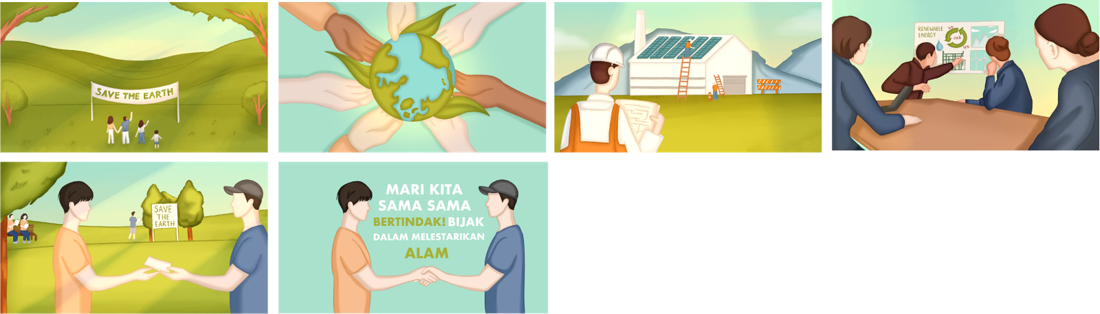 creating a clear visual narrative about sustainability. The friendly character style and calm color palette make the message engaging and easy to understand.