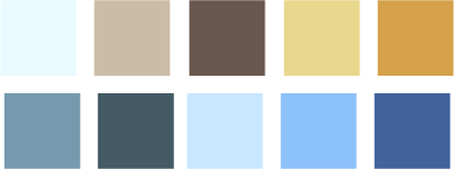 The color palette composed of deep blue, white, and cream conveys