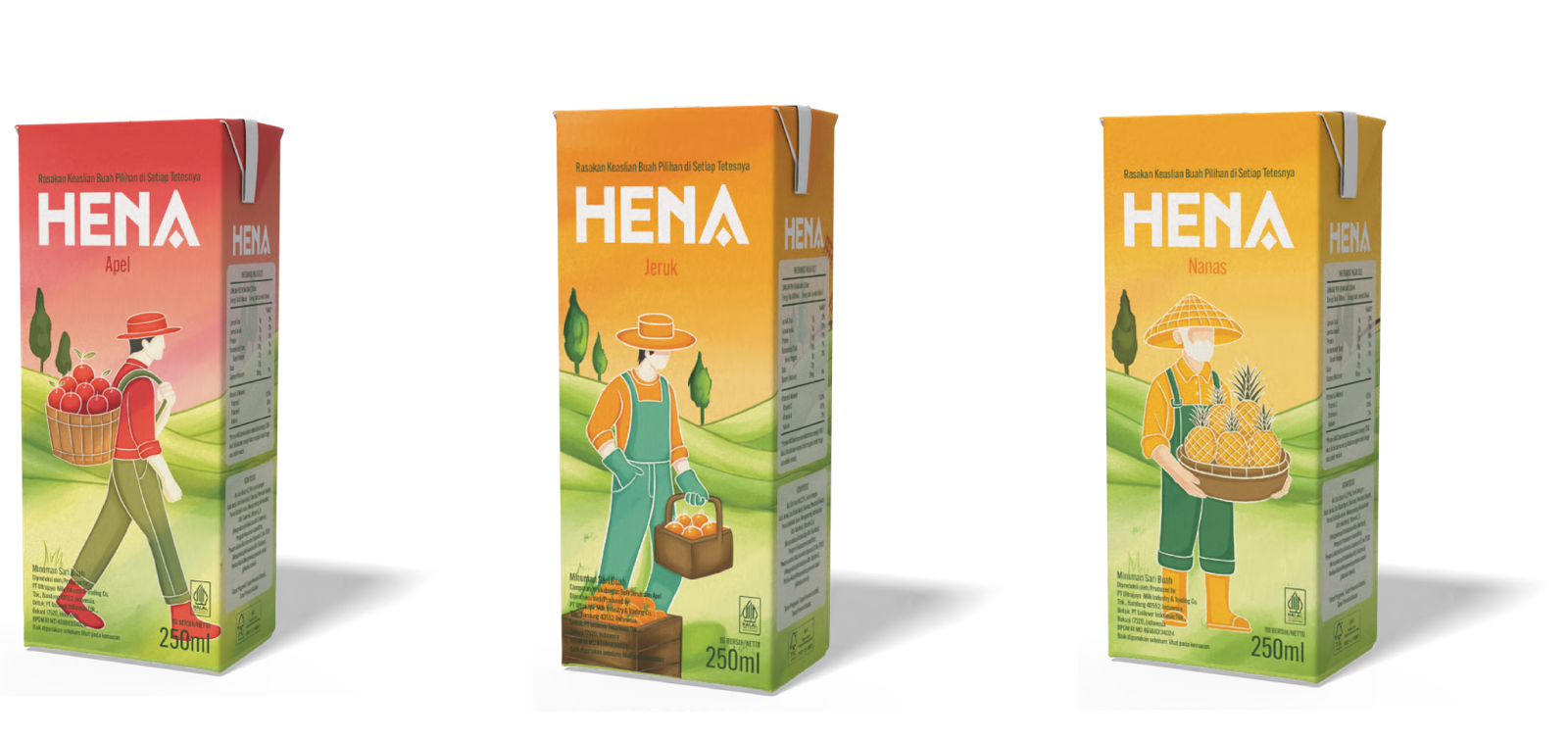 I created a packaging rebranding design for the Hena Juice brand. It features three fruit alternatives: apple, pineapple, and orange. The concept of this design is to highlight the authenticity of the fruit, so I depicted people holding each flavor to represent this.